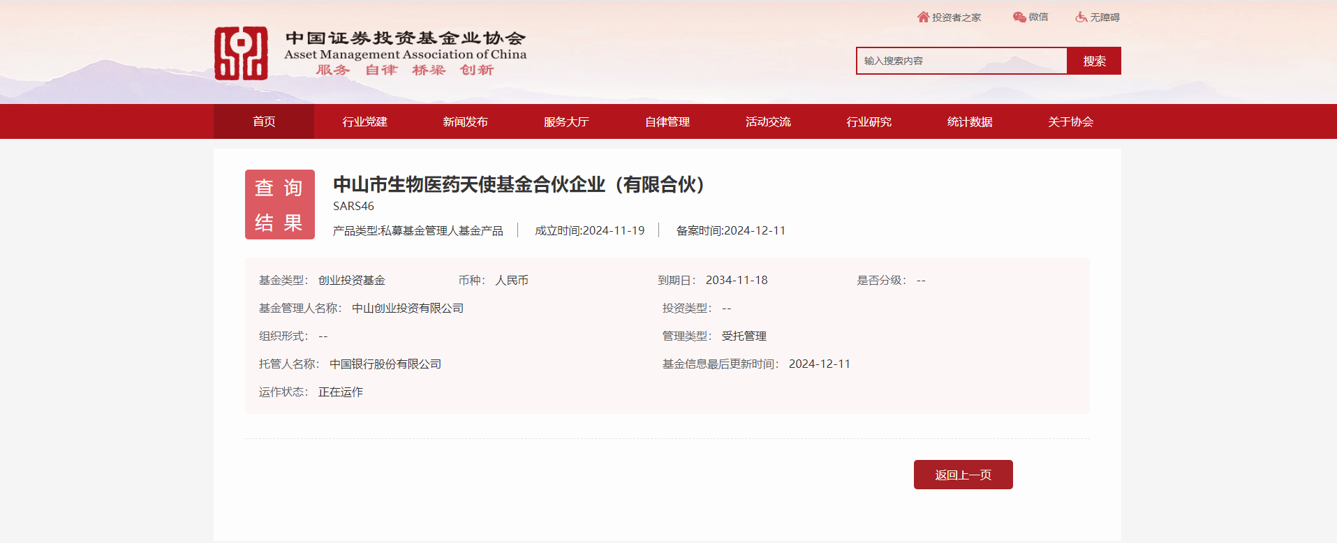 12月11日,天使基金在中國證券投資基金業(yè)協(xié)會完成基金備案。該基金成為中山國資國企首只生物醫(yī)藥天使基金,也是中山國資國企規(guī)模最大的一只生物醫(yī)藥基金。