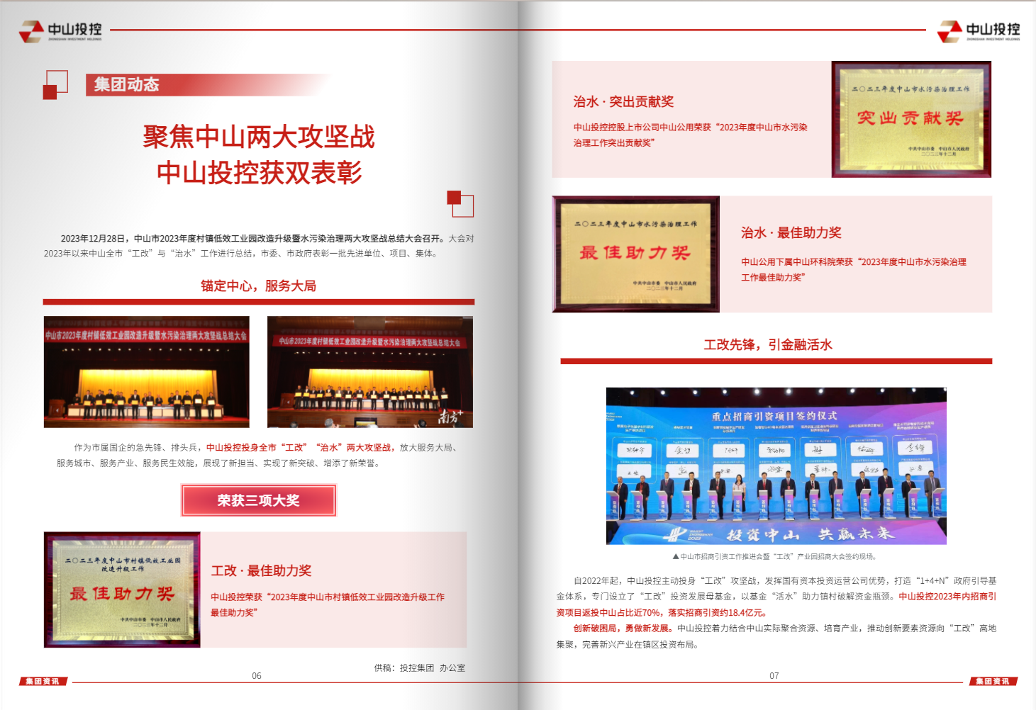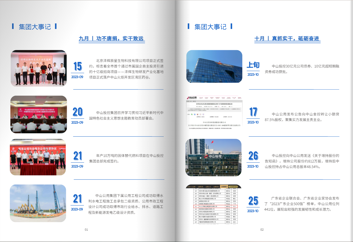 鏡頭拉近到“企業(yè)動(dòng)態(tài)”欄目,這里有招商引資的豪邁氣魄,有治水攻堅(jiān)的連續(xù)作戰(zhàn),有減污降碳的使命擔(dān)當(dāng),更有工程建設(shè)的殫精竭慮。一幕又一幕,中山投控各級(jí)企業(yè)用敢為勇為的行動(dòng)力,逢山開(kāi)路、遇水搭橋。一點(diǎn)又一點(diǎn),投控品牌已由最初的星星之焰,燃燒成燎原之火。多個(gè)動(dòng)力十足的新生企業(yè)升檔、加速、起飛,為集團(tuán)千億資產(chǎn)、百億營(yíng)收、雙十億利潤(rùn)“千百十”目標(biāo)貢獻(xiàn)新力量!