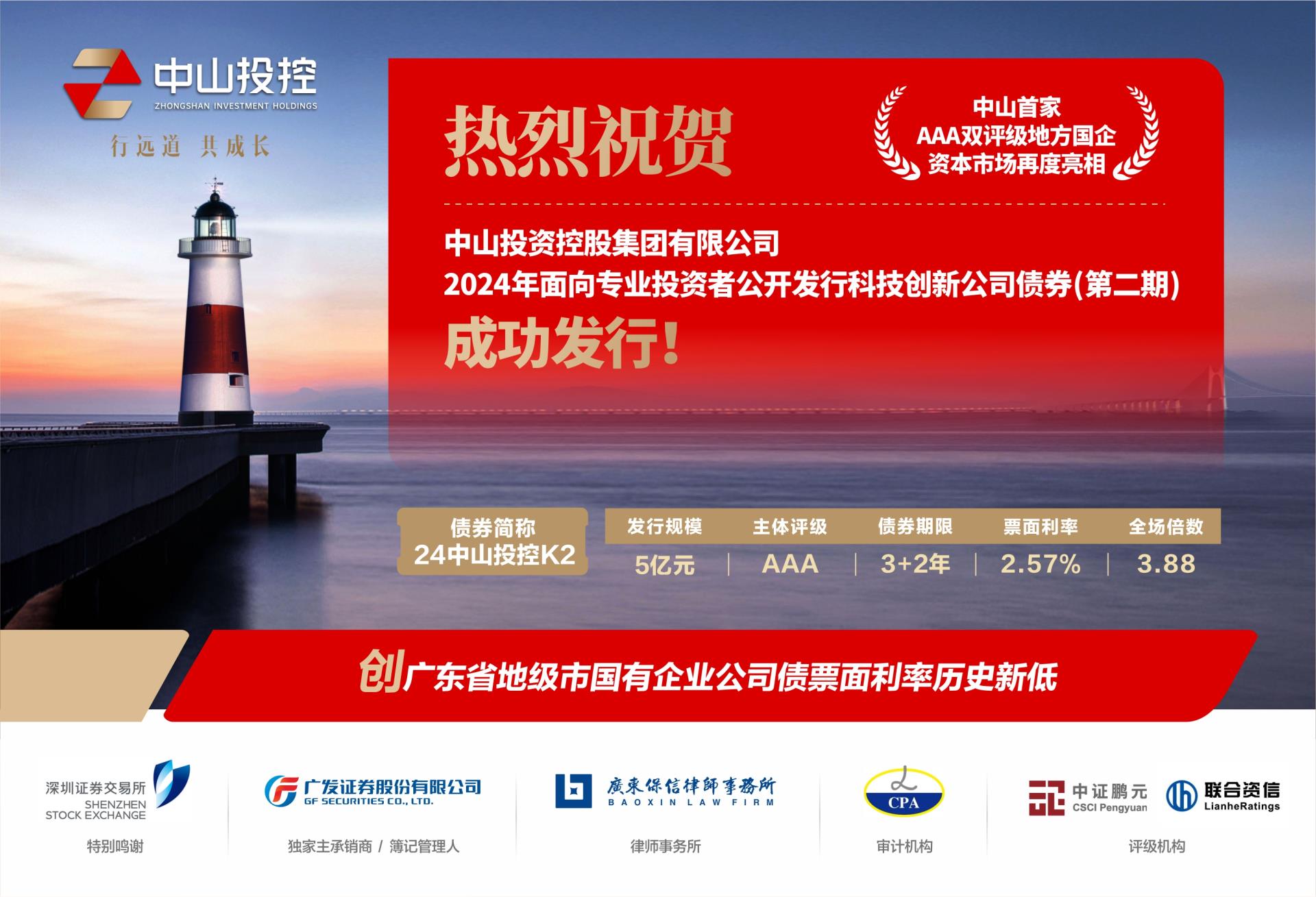 2023年11月以來(lái),中山投控持續(xù)亮相直接融資市場(chǎng),集團(tuán)本部(23中山投控K1)發(fā)行利率2.88%、集團(tuán)本部(24中山投控K1)發(fā)行利率2.67%、控股上市公司中山公用(24中山K1)發(fā)行利率2.63%、本期(24中山投控K2)發(fā)行利率2.57%,持續(xù)刷新中山市地方國(guó)企公司債票面利率最低紀(jì)錄,累計(jì)完成直接融資25億元。