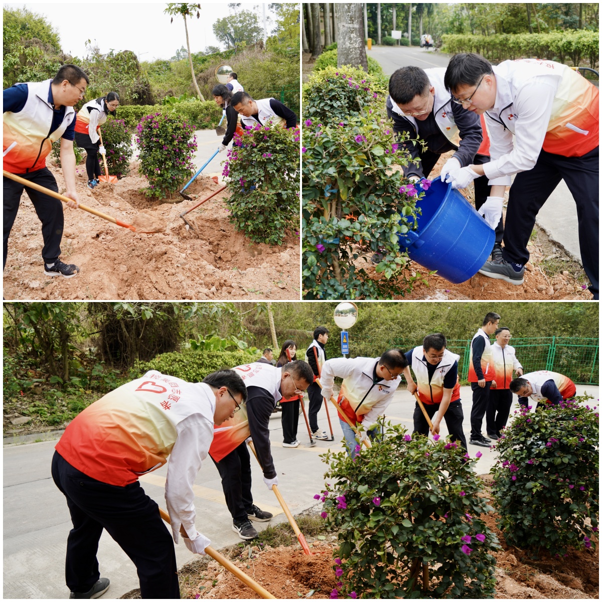 中山投控分會場設(shè)在中山市名城環(huán)境服務(wù)有限公司環(huán)衛(wèi)設(shè)備制造分公司附近?;顒蝇F(xiàn)場,黨旗飄揚,在簡短的啟動儀式后,參與活動的黨員志愿者們迅速分工領(lǐng)取工具,合力種下三角梅、龍眼樹、檸檬樹共150株。大家相互配合,揮鏟挖土、扶苗培土、踏土夯實、培土澆水……經(jīng)過一番辛勤勞作后,一棵棵錯落有致的樹木迎風(fēng)佇立,為美麗中山建設(shè)增添新綠。