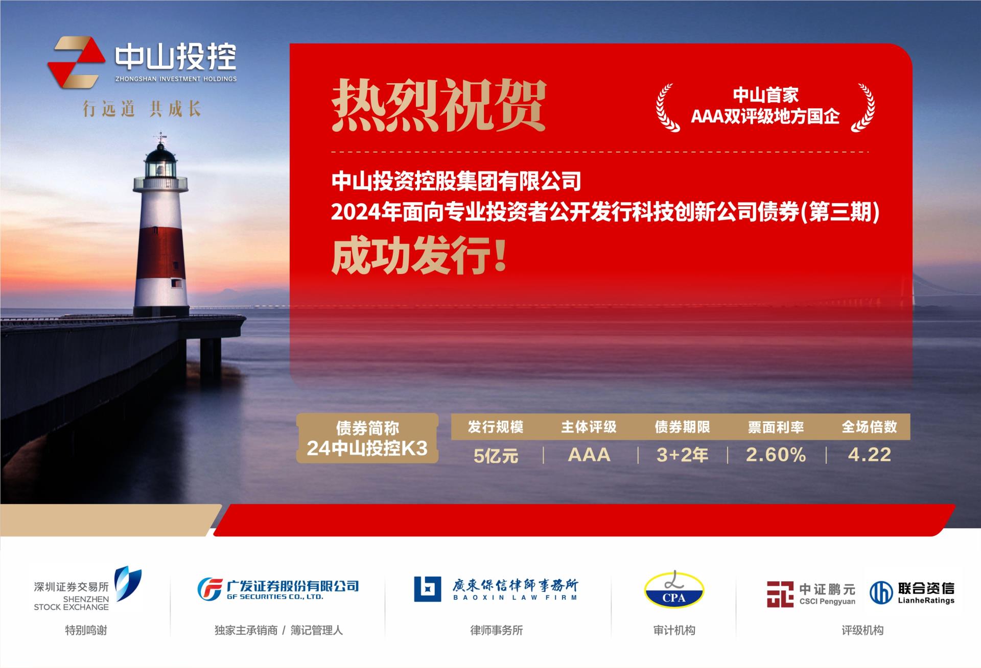 3月26日,中山投控2024年第三期科技創(chuàng)新公司債券(24中山投控K3)在深交所成功發(fā)行,本期債券貼標“科技創(chuàng)新”,募集資金規(guī)模5億元,期限為3+2年,票面利率2.60%,全場認購倍數(shù)達4.22倍,持續(xù)實現(xiàn)低利率發(fā)行。