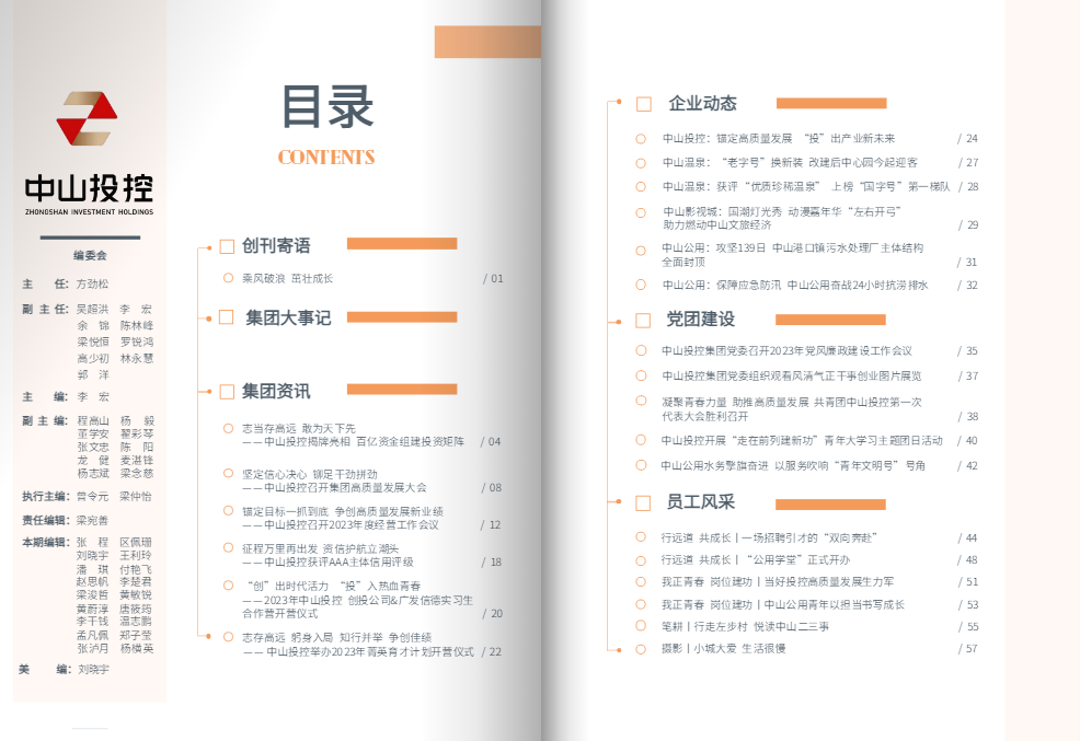 中山投控集團揭牌亮相、獲評AAA主體信用評級、召開高質(zhì)量發(fā)展大會、布局2023年度經(jīng)營工作、舉辦實習(xí)生合作營、啟動菁英育才計劃……本期內(nèi)刊的集團資訊板塊里,回顧了集團自重組以來的重大部署舉措,圍繞“千億資產(chǎn)、百億營收、雙十億利潤”戰(zhàn)略目標(biāo),描繪施工圖,擂起出征鼓,吹響沖鋒號。