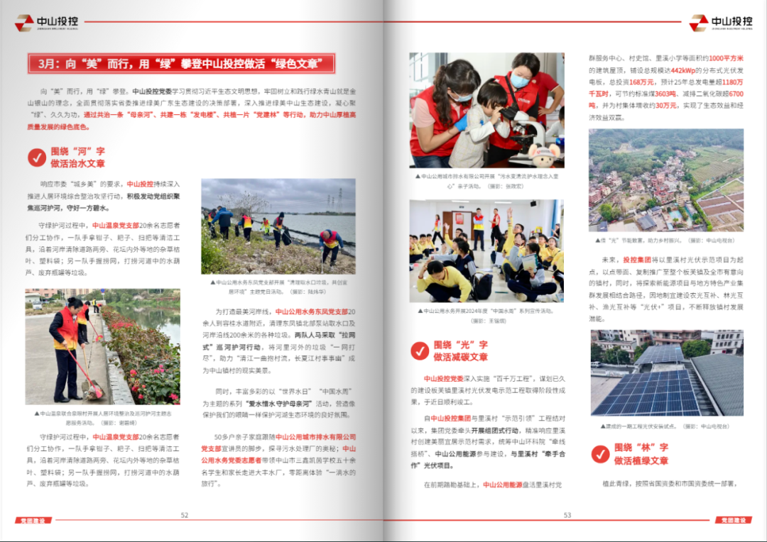 在“黨團(tuán)建設(shè)”欄目,聚焦呈現(xiàn)投控集團(tuán)有聲有色的黨建成果——增添發(fā)展“紅色動(dòng)能”,主題教育再深入,基層述職再抓實(shí),引領(lǐng)集團(tuán)高質(zhì)量發(fā)展再提速;助力建設(shè)“綠美中山”,推進(jìn)共治一條“母親河”、共建一棟“發(fā)電樓”、共植一片“公益林”;擦亮黨建“金字招牌”,集團(tuán)新增市級(jí)“青年文明號(hào)”集體,公用水務(wù)下屬黨支部再添“五好”模范稱號(hào),盡顯戰(zhàn)斗堡壘和先鋒模范作用。