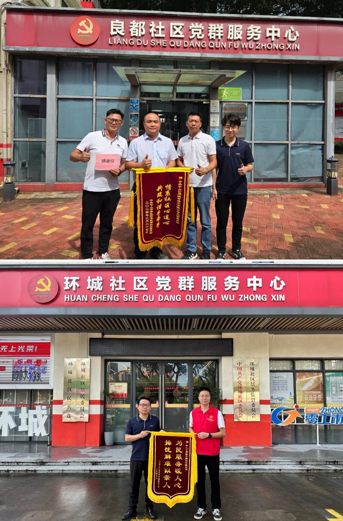 ▲近日,中山市南區(qū)良都社區(qū)黨群服務(wù)中心代表向排水公司贈(zèng)送錦旗和感謝信/ 南區(qū)環(huán)城社區(qū)代表向排水公司贈(zèng)送錦旗。(攝影:張澤楓、梁小其)