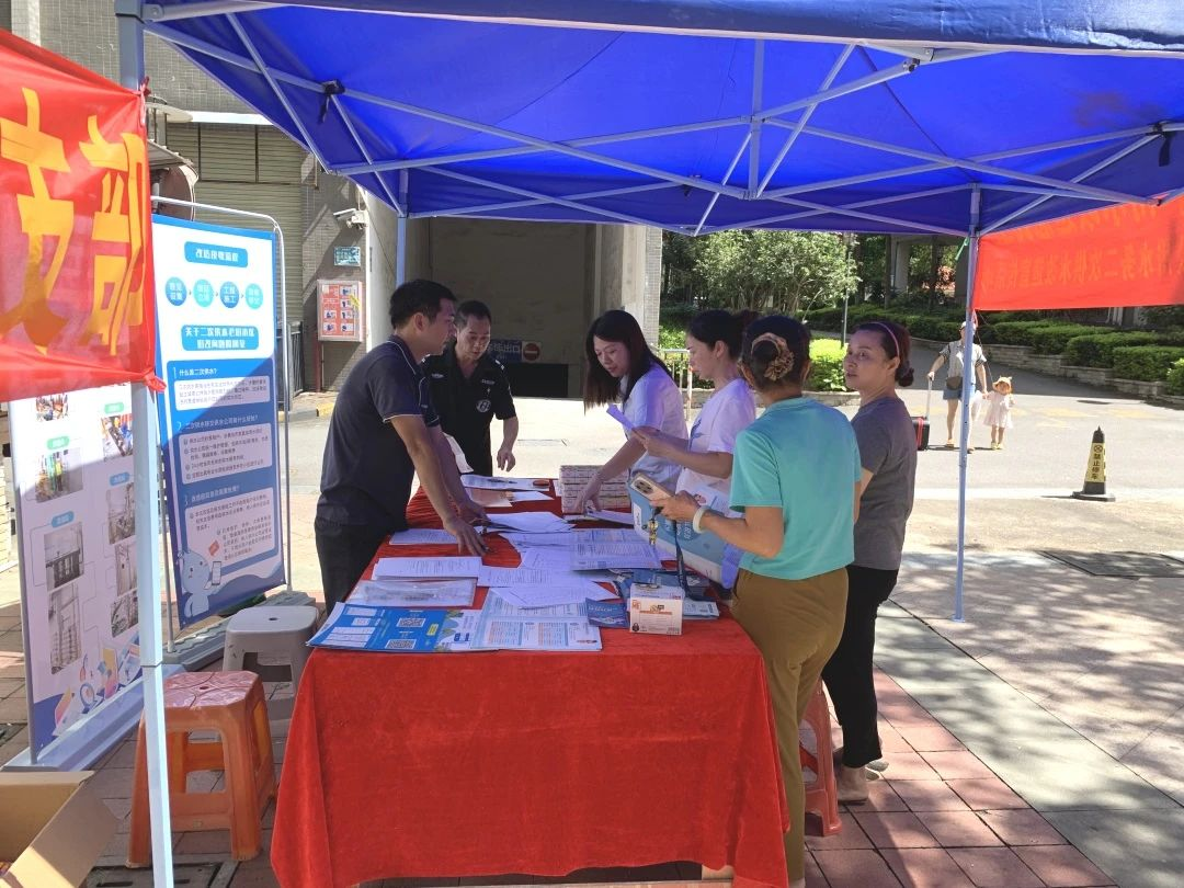 中山公用水務(wù)阜沙供水黨支部及客服中心工作人員走進(jìn)阜豐豪庭小區(qū),通過(guò)派發(fā)項(xiàng)目宣傳手冊(cè)、介紹管理服務(wù)內(nèi)容、宣傳用水節(jié)水知識(shí)、登記意向說(shuō)明等,廣泛宣傳二次供水改造項(xiàng)目。