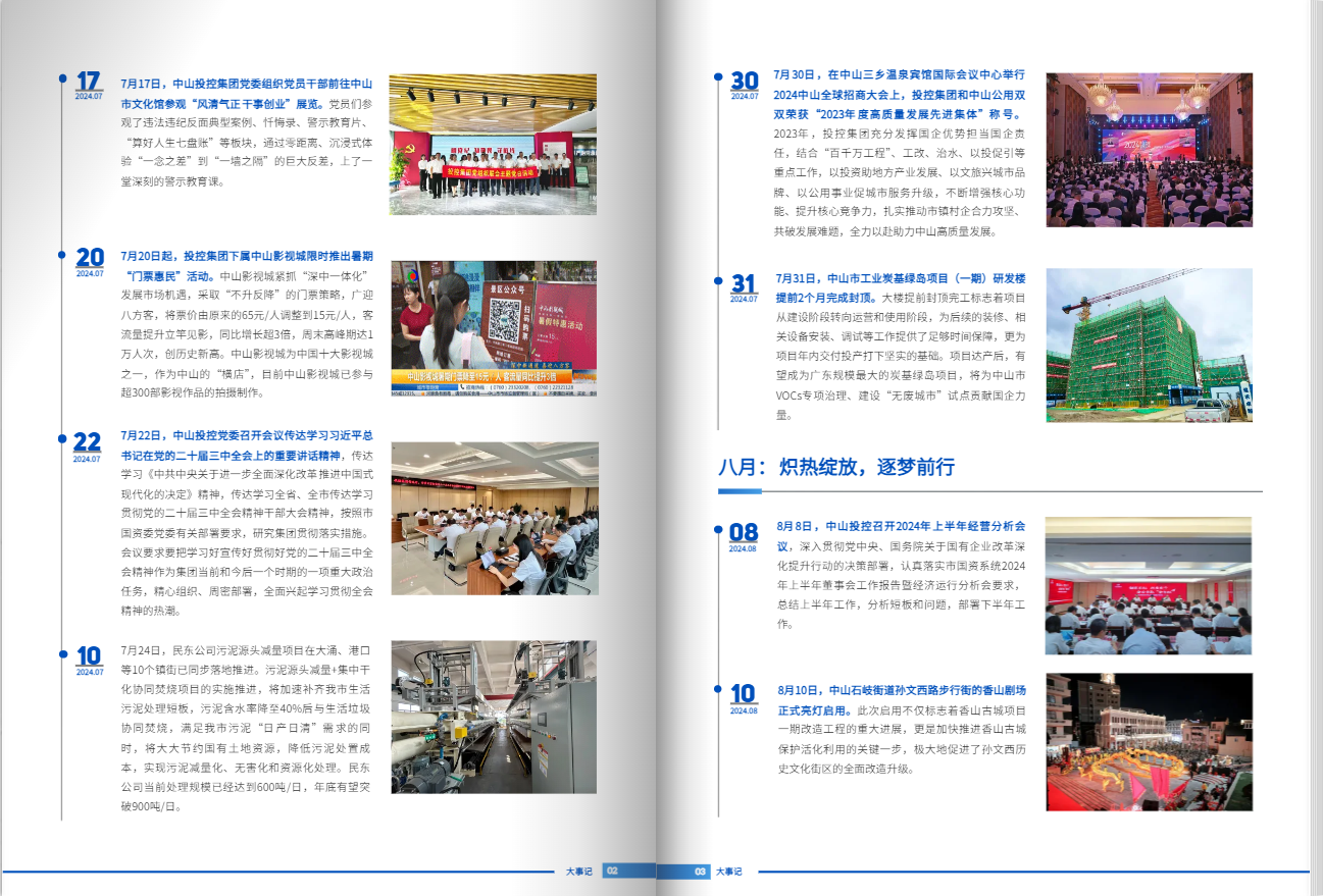 在 “集團(tuán)大事記” 欄目中,時(shí)間如無聲的見證者?;赝谌径龋犊厝她R心協(xié)力,在各個(gè)領(lǐng)域留下堅(jiān)實(shí)的腳印。集團(tuán)雙獲獎(jiǎng)、雙30強(qiáng),投資新進(jìn)度、項(xiàng)目開工/投產(chǎn),文旅新特色、公用新成效、百千萬助力……我們堅(jiān)信每一個(gè)行動(dòng)都是成長(zhǎng)的注腳,每一份付出都是前進(jìn)的動(dòng)力。投控人將以更加堅(jiān)定的信念和昂揚(yáng)的斗志,在以投促引、文化興城、服務(wù)民生的道路上不斷前行。